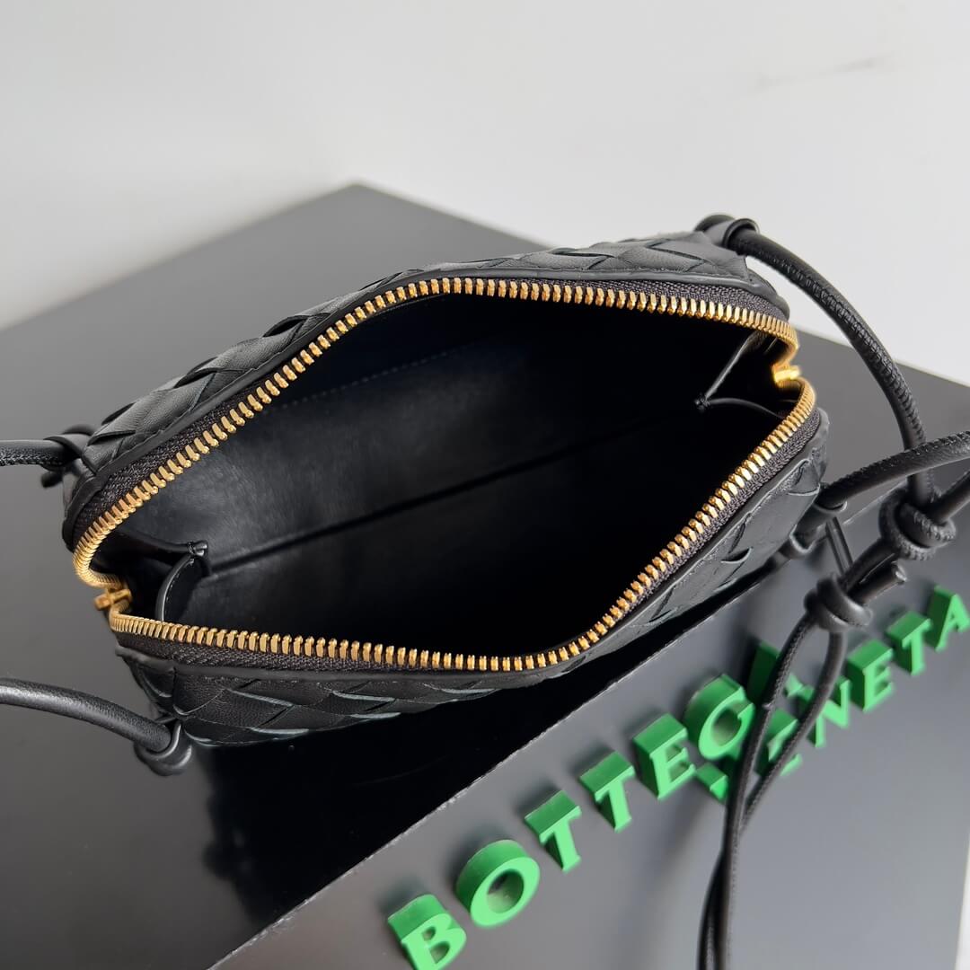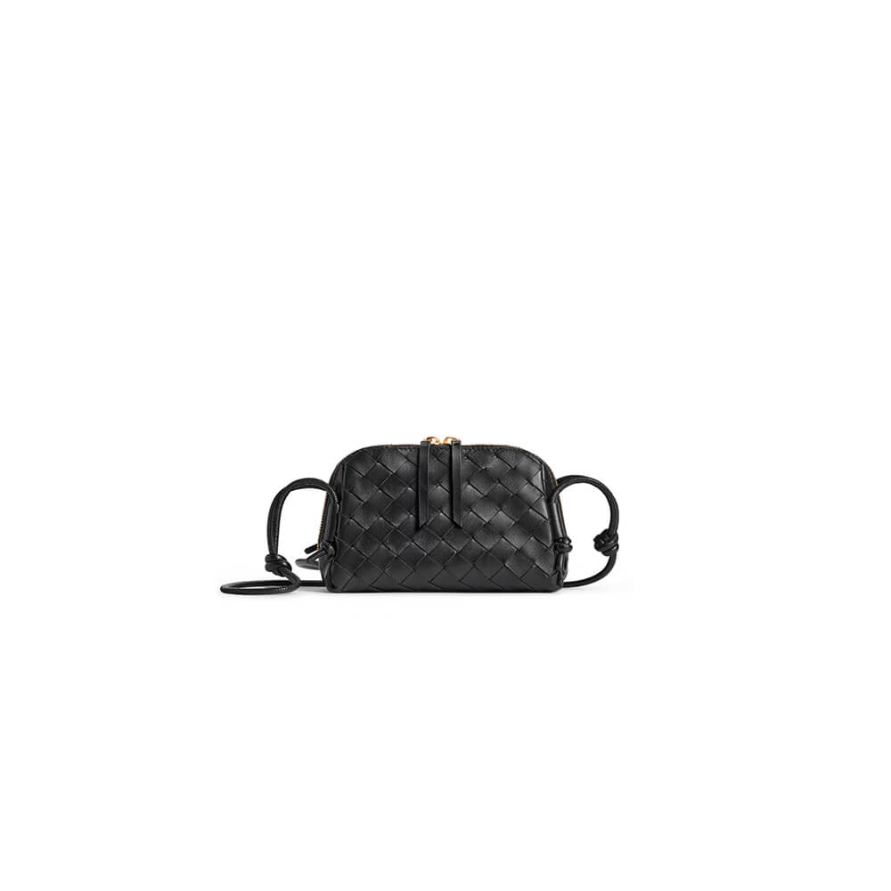Intrecciato nappa leather pouch with adjustable tubular strap.